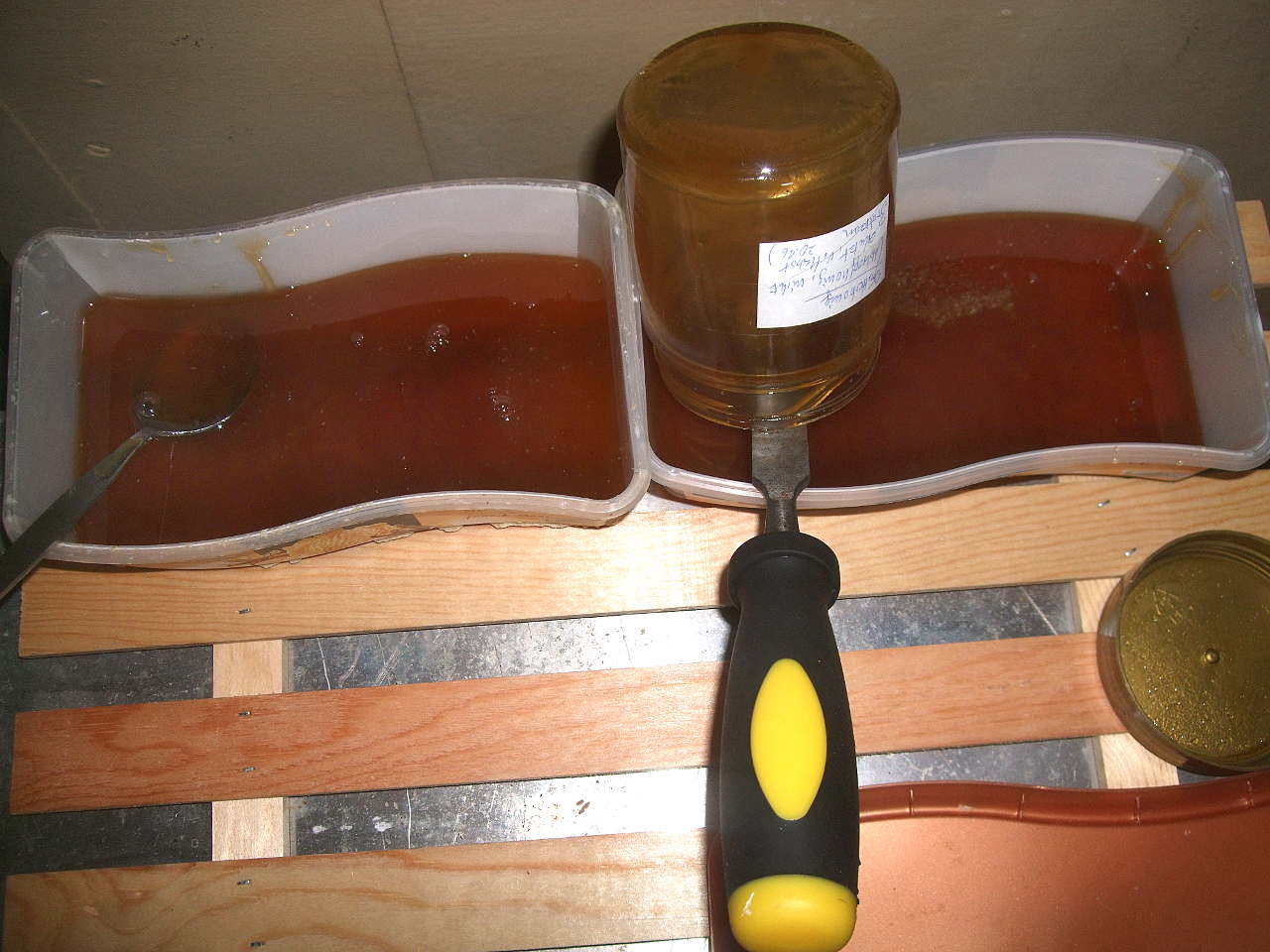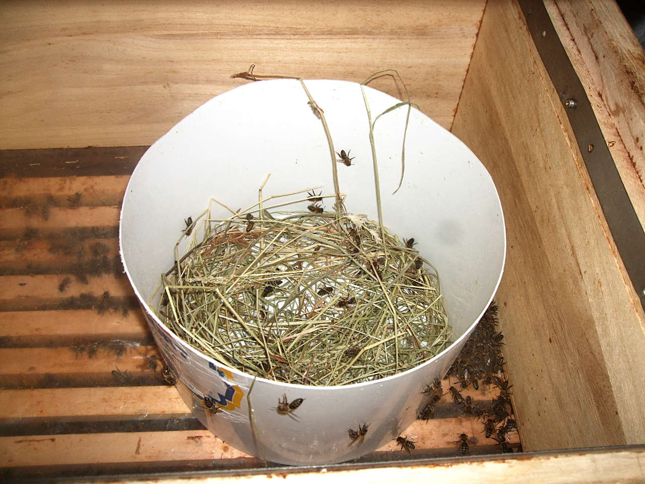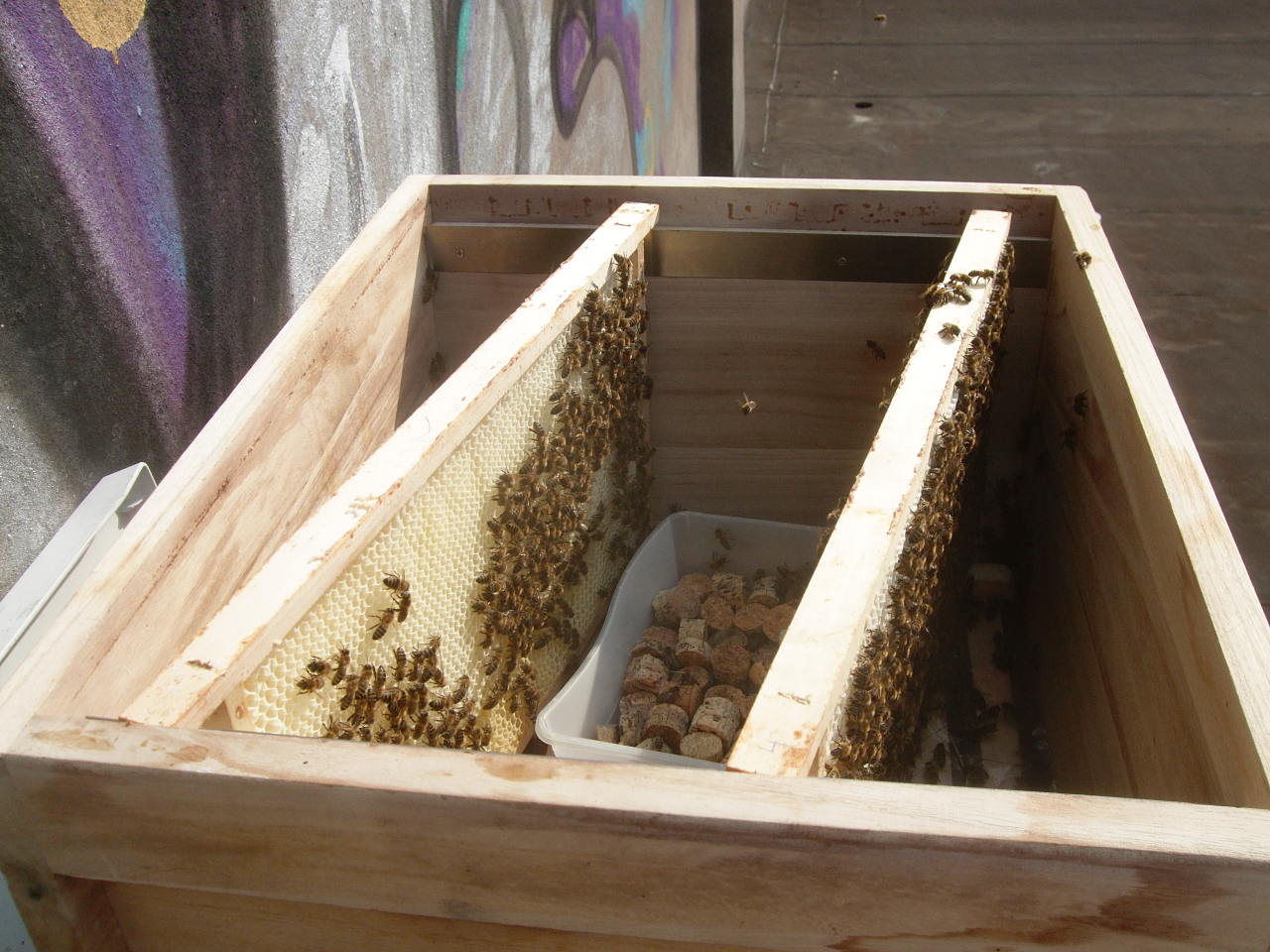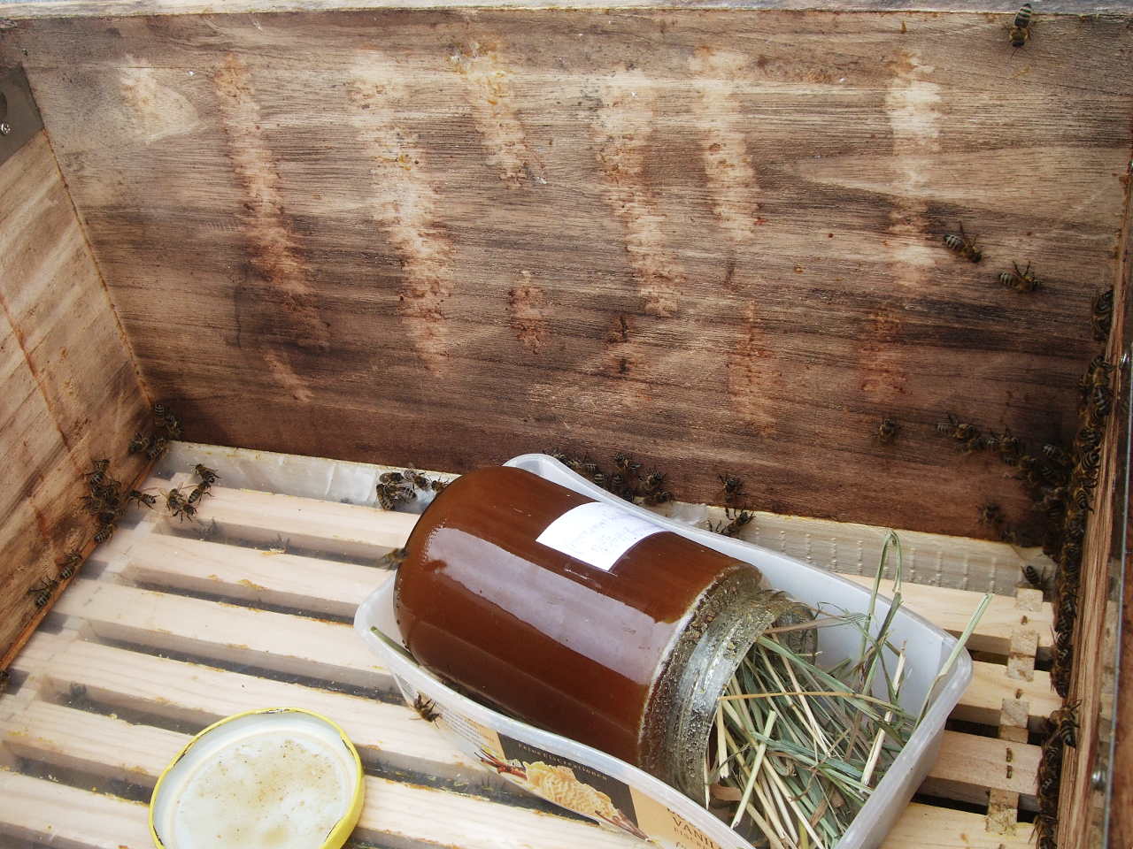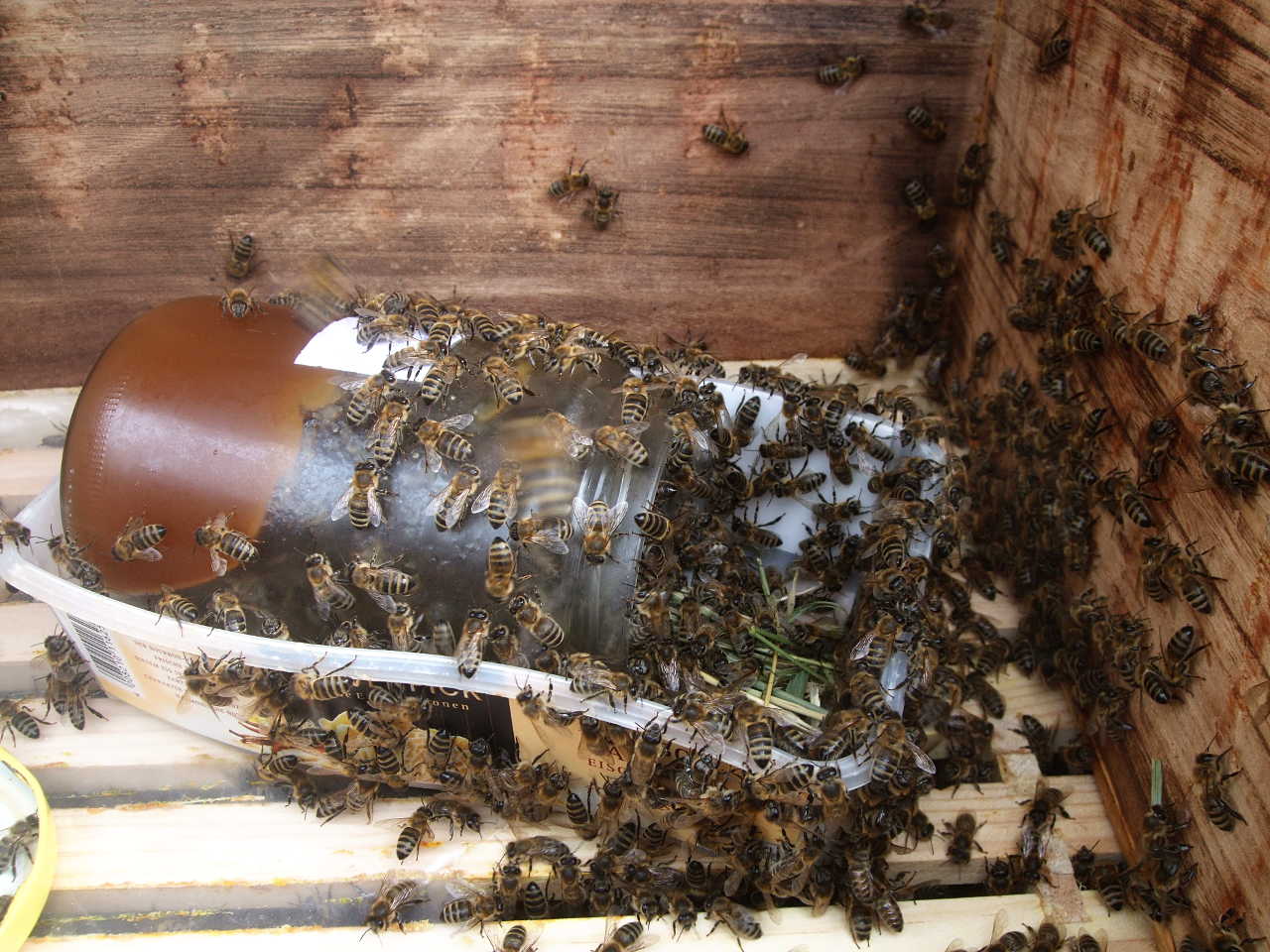Bienen müssen für den Winter ausreichend Nahrung haben - insbesondere nach dem "Honigklau". Dazu füttere ich die Bienen von "oben", da das mit weniger Störung verbunden ist, in einer "Leer-Zarge" oder einer extra "Futter-Zarge". Von letzterer habe ich eine. Die scheint zwar wasserdicht - ich habe sie mit "Mittelwand"-Wachs ausgegossen & 2 Tage mit Wasser stehen lassen - aber das Futter gibts darin trotzdem in kleinen Näpfen. So ist es besser portionierbar und ich lerne den Verbrauch besser einzuschätzen.
